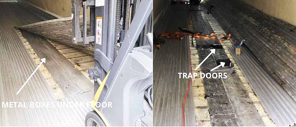 18-Wheeler trailer floor compartment with approx 1.27 million pills and 104 lbs of cocaine