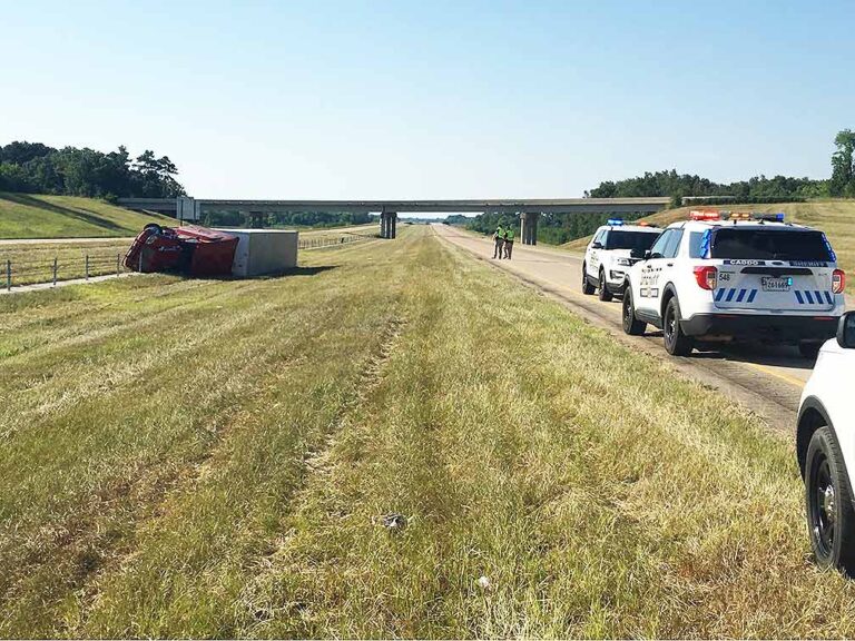 Caddo Parish Sheriff’s Office said that the tractor-trailer was heading south to Houston when it hit a bump and the driver lost control. The 18-wheeler, which was transporting ferric chloride, flipped over the median.