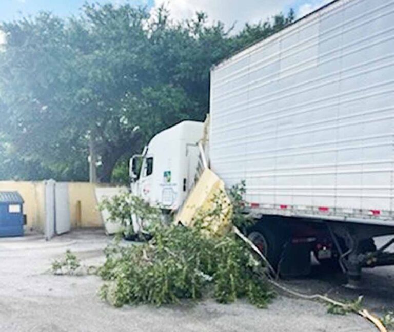 Wink News reports that Michael Calvo, 51, of Cape Coral, Florida, was making a delivery in the back area of a Publix shopping center at 617 U.S. Highway 17-92 West when his truck tore the awning off the building and hit an unoccupied pickup truck. Calvo’s tractor-trailer pushed the truck for approximately 200 feet, ending with both vehicles being totaled.