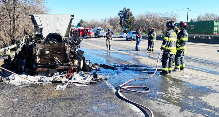 The fire started at approximately 10 a.m., according to the California Highway Patrol. The driver was able to pull onto the highway’s right shoulder as the tractor became fully engulfed.