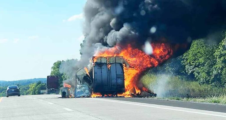 WKDZ reports that the tractor-trailer was carrying washers and dryers. It caught on fire at the 63-mile marker. Three fire departments were called to the scene.
