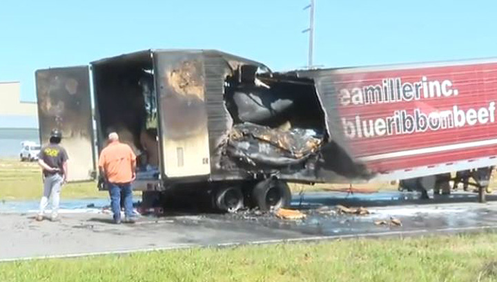 Authorities said the trailer’s back wheels caught fire, which caused an explosion.