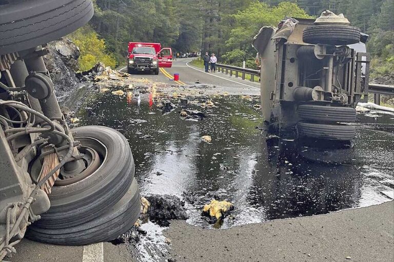The driver continued for another mile until the trailer overturned, spilling hot asphalt binder, which began seeping into the Smith River, SFGate reported Sunday.
