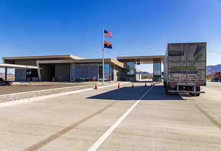 As a commercial vehicle approaches the port of entry, highway signs direct the driver into the right lane. When the truck is a half mile from the port, the weigh-in-motion sensors and cameras capture the vehicle’s weight and identifying information and relay it to Arizona DOT enforcement and compliance officers at the port.
