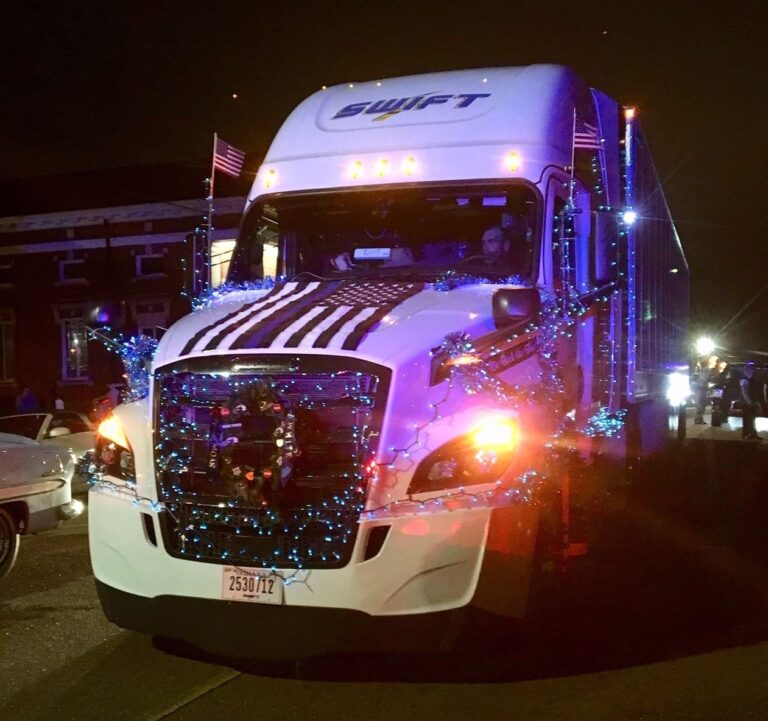 Held the night of November 30, Brookhaven’s annual Christmas parade seemed the ideal time to Copeland to deck out his white 2019 Freightliner Cascadia in blue Christmas lights, blue and silver garlands and wreaths.