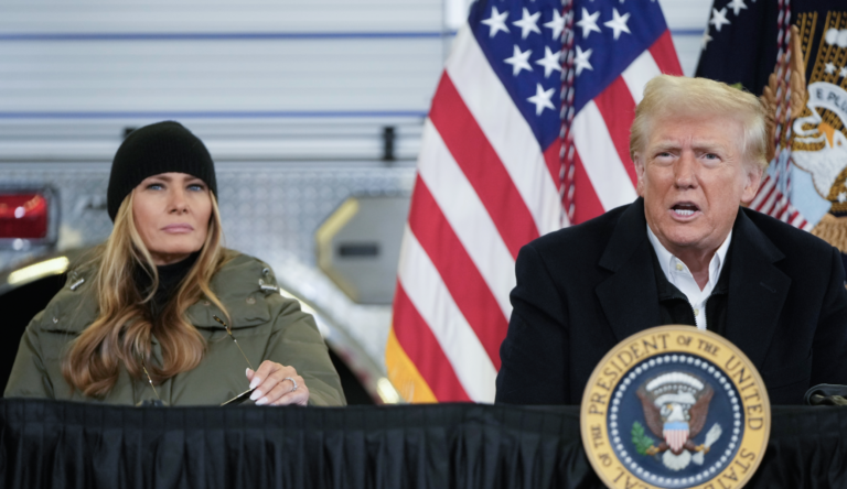 Trump flew over several devastated neighborhoods in Marine One, the presidential helicopter, before landing in Pacific Palisades, a hard-hit community that’s home to some of Southern California’s rich and famous. Accompanied by first lady Melania Trump, he walked a street where all the houses have burned, chatting with residents and police officers.