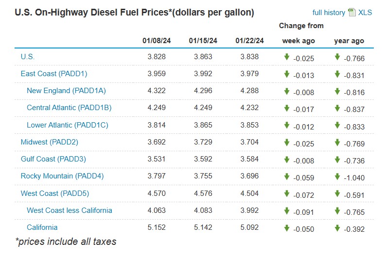 As of Jan. 22, the price sat at $3.838 per gallon, down from $3.863 per gallon on Jan. 15.