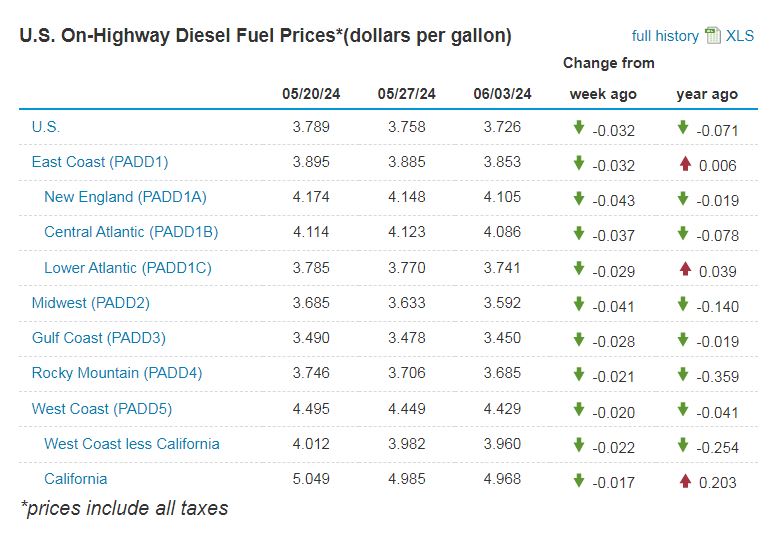 According to the Energy Information Administration (EIA), drivers around the country are paying $3.726 per gallon. That’s down from $3.758 on May 27 and $3.789 on May 20.
