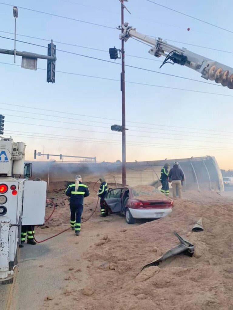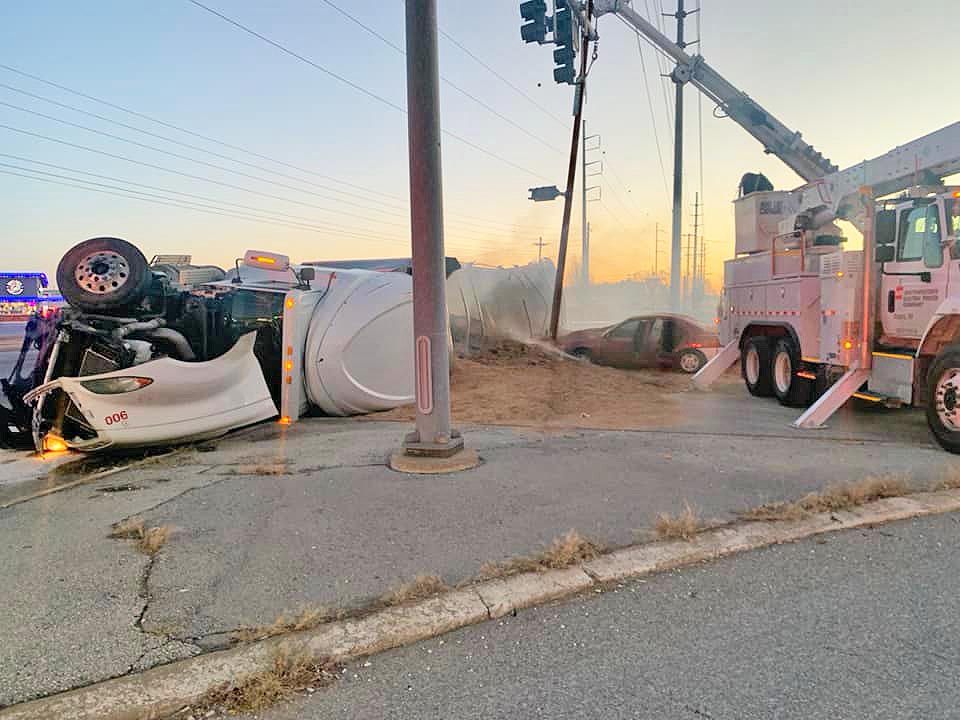 According to THV11 in Little Rock, the crash knocked over power lines and backed up morning rush hour traffic in Rogers. At least one other vehicle was involved in the accident, though only the truck driver was reported to have been injured. A photo from the Rogers Police Department showed a compact car at the wreck scene covered in sawdust.