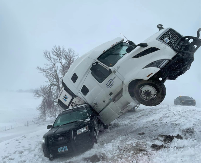 MINNEHANA COUNTY, S.D. — In a scene that could have been straight out of the latest action flick, an 18-wheeler collided with a South Dakota Highway Patrol (SDHP) trooper’s vehicle on Thursday, March 16, along Interstate 90 near mile marker 392, leaving the tractor in a mid-air jackknife atop the patrol unit