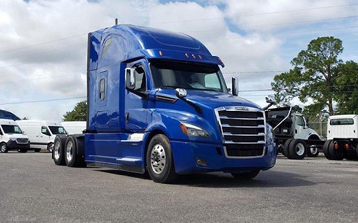 The giveaway truck, a 2020 Freightliner Cascadia 126, is viper blue in color and features a Detroit DD15, 14.8 L engine and a Detroit DT12 automated transmission.