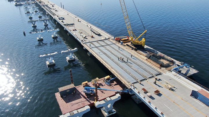 Multiple teams are working concurrently around the clock to ensure pile-driving efforts remain on schedule. Crews are moving the pile-driving template ahead and working on pier removal at night to keep ahead of the daytime pile-driving crews. Beams are also being set at several spans on the Pensacola Bay Bridge, and deck work to reconstruct the roadway has begun.