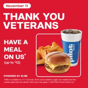 On Veterans Day, service members and their families verified through ID.me in the myRewards Plus app will be eligible for a free meal credit up to $12.* The Veterans Day offer can be claimed on Nov. 11 through Pilot’s myRewards Plus app and redeemed at participating Pilot, Flying J and One9 Fuel Network travel centers on a variety of food and beverage options, including hot and cold deli items, fountain beverages and Pilot coffee.*