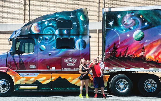 The rig has also caught the attention of CAT Scale folks. In 2017, the couple’s truck was one of 60 trucks featured on CAT Scale Super Trucks Cards. The couple agree that the attention certainly helps their trucking company, dubbed No Destination Trucking, capture attention both on and off the highway. Along with the unique truck decor, Bradshaw and Bowlby wanted their company name to stand out.