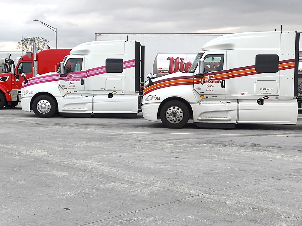 Harguth didn’t get that pink truck — but she got the next best thing. Gary, South Dakota-based Cliff Viessman Inc., the carrier for which she drives, operates about 350 tractors that are painted white with a triple-stripe graphic featuring maroon, orange and red. One truck, however, is different. This one features stripes in varying shades of pink. It’s Nan Harguth’s truck, a 2022 International LT with an A26 Navistar engine and a 12-speed auto-shift transmission.