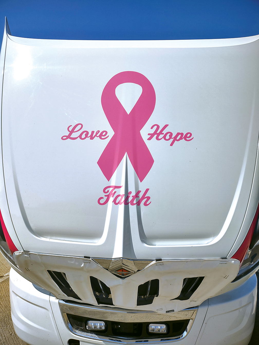 On the outside, Harguth has added extra graphics. A pink ribbon festoons the side of the tractor, along with the words “dedicated to all that have battled.” “Cancer Sucks” is emblazoned across the rear of the sleeper.