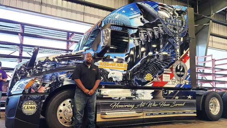 Schneider’s Ride of Pride program features specially designed Freightliner trucks that serve as rolling tributes to the nation’s military. Through the program, Freightliner has presented Schneider with a total of 14 U.S. Ride of Pride trucks — the most awarded to any carrier — since the program began in 2001.