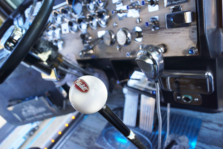 The finished product is a close replica of Brandon’s own 1994 Peterbilt 379, which was a rock-hauling truck for most of its career — until Davis lovingly restored it. That Pete, with a white-on-light-blue color scheme, sports a Caterpillar 3406 mechanical engine and an 18-speed manual transmission.