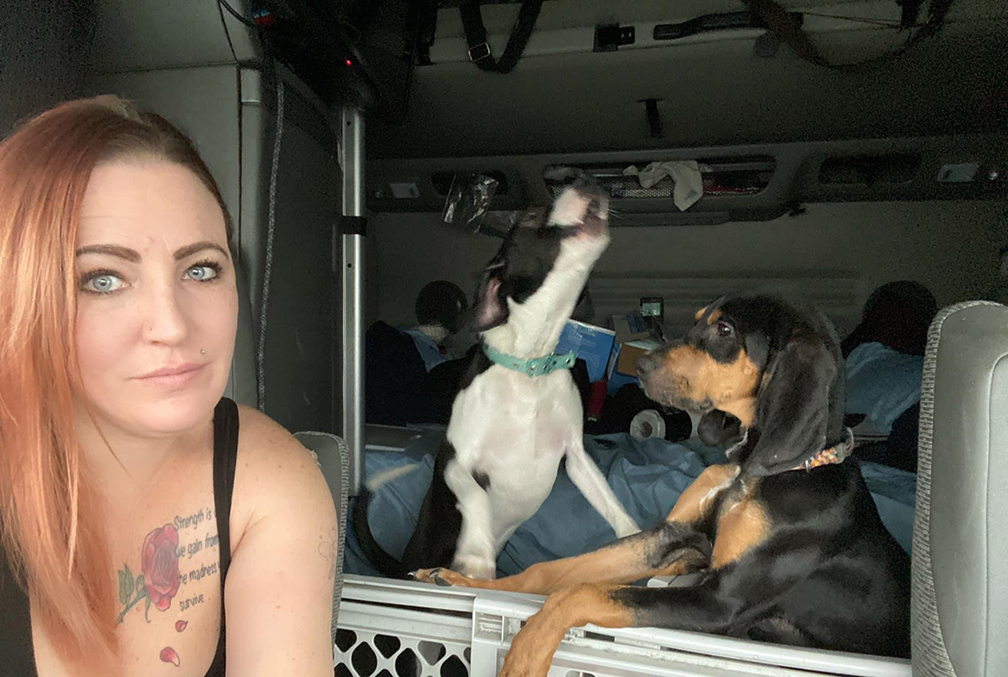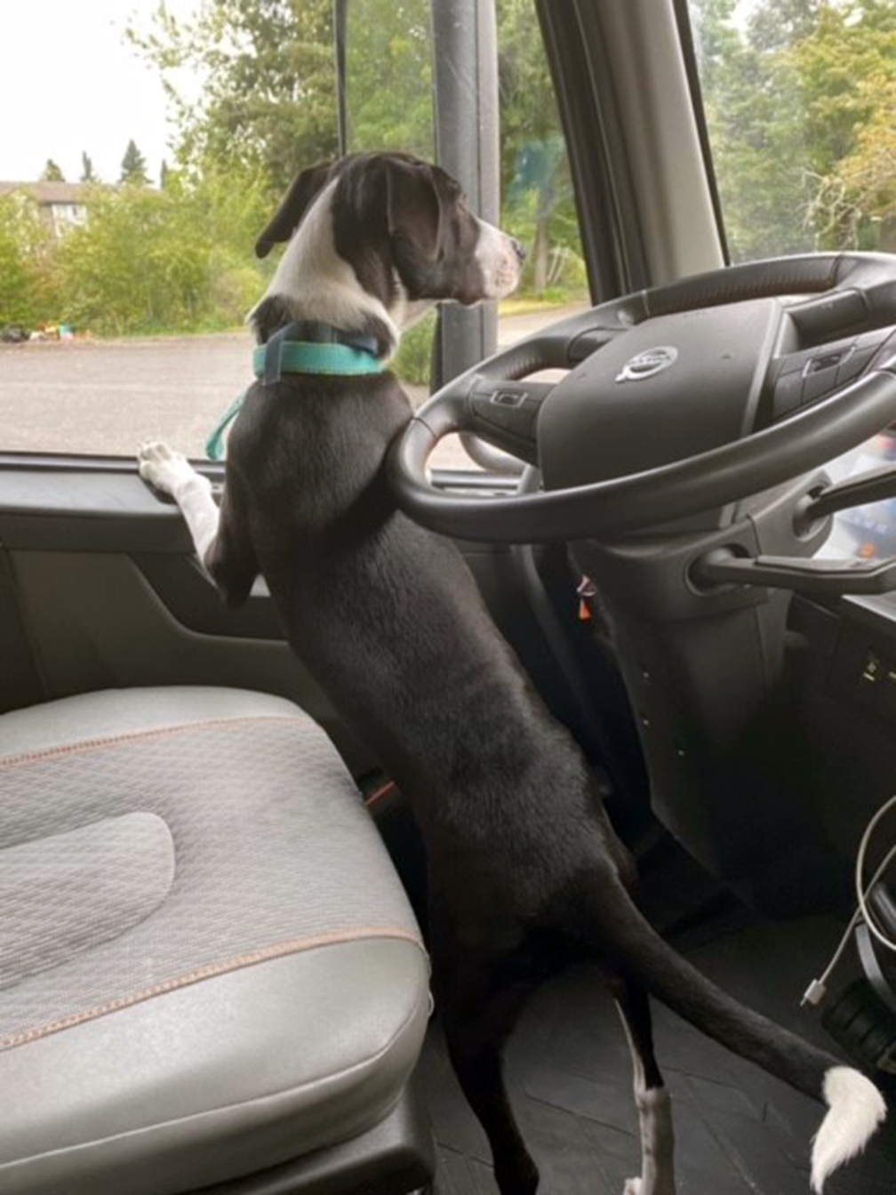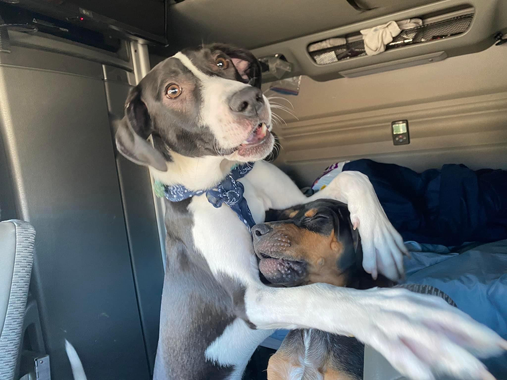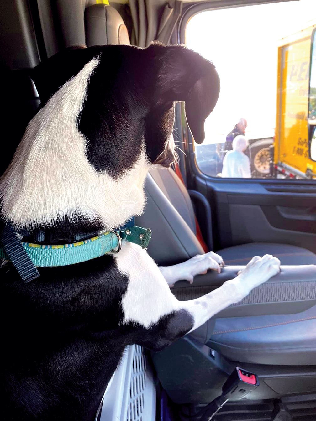 Dog parents, much like parents of humans, have to have a certain set of survival skills, such as a sense of humor, a massive amount of patience, and excellent problem-solving abilities. In the cab of a truck — Eyler drives a 2021 Volvo VNL860, coast-to-coast – these skills are even more in demand.
