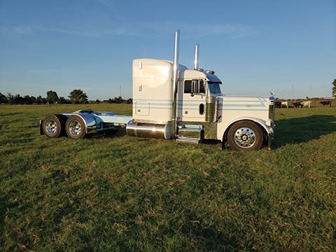 Cooper drives a 1998 Peterbilt 379 extended hood with a 550 horsepower Caterpillar 3406E engine. He purchased the truck in 2011 and has put an extensive amount of work into it. The pearl white tractor is finished with a baby blue frame and accents, and it looks good enough to be featured on a Cat Scale Super Truck collector card.