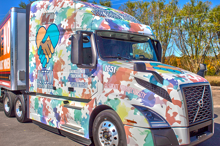 When John Tibbs climbs into his rolling office and fires up the Volvo VNL760, he turns heads just about anywhere he goes. That’s thanks to the fully wrapped cab that features graphics of puzzle pieces and a handshake, arranged to form a heart. Amid the colorful shapes, slogans proclaim: “Celebrate neurodiversity” and “Help raise autism awareness.” The truck’s cab is crowned with the phrase, “There is no cure for being yourself.”