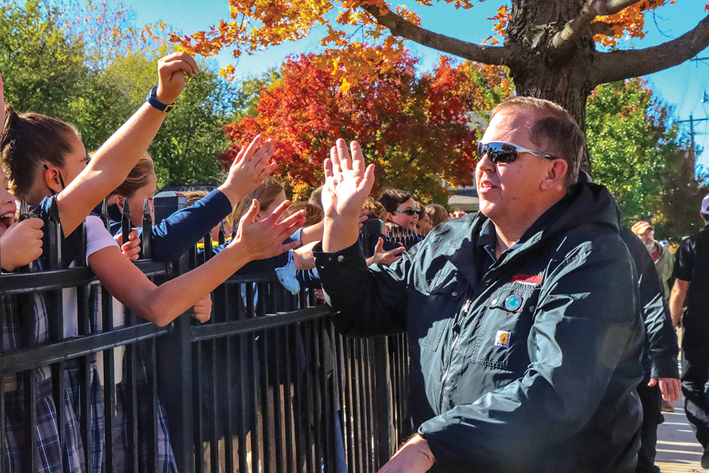 One of the six System Transport professional truck drivers who hauled the tree, Jeremy Bellinger of Spokane, Washington, received high-fives at an event. He has 21 years’ experience as a commercial glass driver.