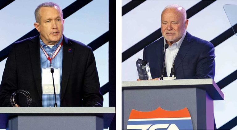 Each year during the Truckload Carriers Association’s (TCA) convention, two industry leaders are presented with the coveted Chairman’s Choice and Past Chairmen’s awards. This year, the recipients were Rence Oliphant, vice president of global sales for Hendrickson and Robert Low, founder and owner of Prime Inc.