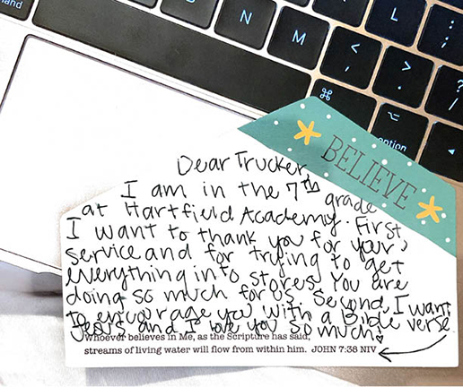 “We wrote letters and put a Bible verse on (each one) to encourage these drivers,” she said. “They are on the forefront, just like the first responders and medical teams. They are getting goods to the stores.”