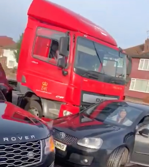 Apparently it is harder to see out of the front window of a semi in England! The Trucker News Staff - December 18, 2019 This video was obviously shot somewhere in England. Hard to believe the guy did not know he hit the car and was pushing it for